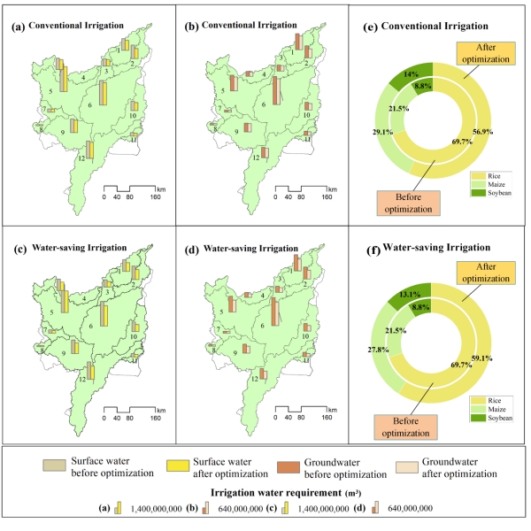 圖3 水資源優化結果:(a) 優化前后常規灌溉模式下地表水配置;(b) 優化前后常規灌溉模式下地下水配置;(c) 優化前后節水灌溉模式下地表水配置;(d) 優化前后節水灌溉模式下地下水配置;(e) 優化前后常規灌溉模式下作物灌溉用水分配比例;(f) 優化前后節水灌溉模式下作物灌溉用水分配比例?