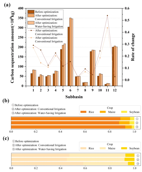 針對上述問題,本研究以中國三江平原為例,結合分布式水文模型(CWatM)和改進的基于水-碳-糧食-生態耦合的水土資源空間優化配置模型(圖1和圖2),實現了水資源、固碳量、糧食產量和生態系統連通性多維要素的協同與權衡。具體結果如下:(1)三江平原水資源量在156~479億m3之間波動。由于水利工程和水土資源時空不匹配性,現有可利用水資源量無法可持續支撐三江平原4000萬畝水稻田種植規模。(2)在常規灌溉模式下,優化后水稻、玉米和大豆的種植比例由現狀的3:2:1調整為2.2:2.4:1.4,可節約灌溉用水23億m3,濕地面積增加10204公頃,總固碳量可增加153億kg,總生態效益提升102億元,空間優化后生態連通性可提高2.8%。(3)在節水灌溉模式下,優化水稻、玉米和大豆的種植比例調整為 2.3:2.4:1.3,可節約灌溉用水45億m3,總固碳量增加137億kg,濕地面積增加5609ha,總生態效益提升27億元,空間優化后生態連通性提高2.3%(圖3-圖5)。